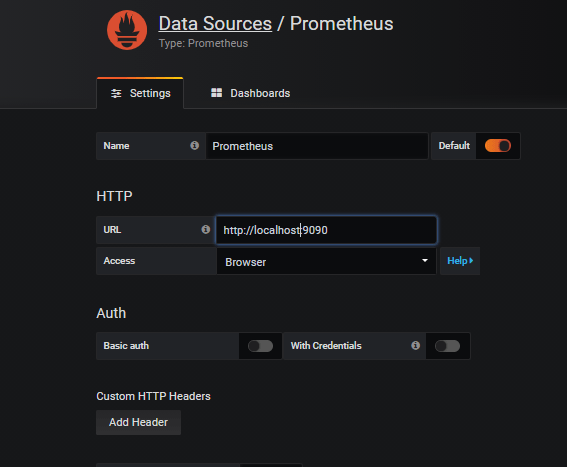 - Select Prometheus Datasource and configure where your Prometheus DB is running