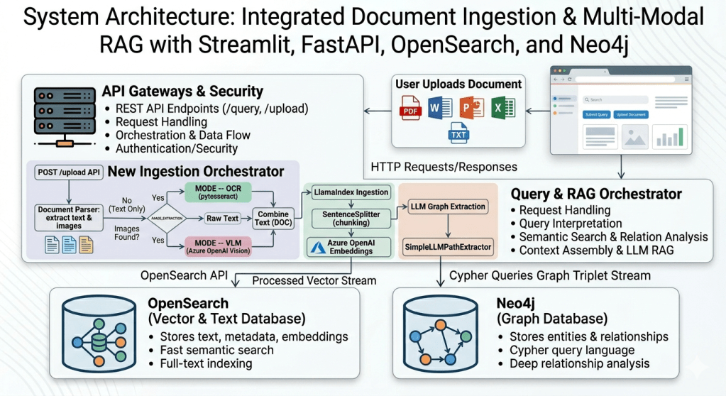 Vector-only RAG optimizes for semantic recall, but it has a predictable failure mode: relationship-heavy questions force the LLM to infer structure from unstructured text. Graph databases model that structure explicitly and support reproducible traversals, but they don’t replace semantic retrieval. This post walks through GraphFusion AI, an intent-aware hybrid retrieval solution that combines OpenSearch kNN with Neo4j graph traversal, then fuses and ranks results before LLM synthesis (FastAPI + Streamlit + LlamaIndex + Azure OpenAI).
